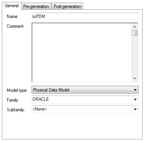 Now we have a transform, we need a profile to include it in. There are only a few options to choose from. When the model type is Physical Data Model, you can select a Family and Sub-Family which correspond to the target RDBMS and sub-family in the target model. This tells PowerDesigner which transformations to allow/deny (show/hide) when you’re actually generating a data model. I’m using Oracle here (mainly to make it easy to find the right box in the picture below), although you can leave them blank and have them apply universally. I’ve named my profile toPDM.