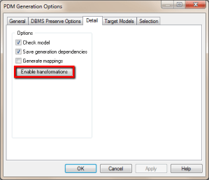 The only thing left is to generate the PDM. You won’t need see the transformations by default but you’re just a few clicks away. On the PDM Generation Options dialog, you’ll need to go to the detail tab and click on the “Enable Transformations” box.