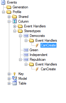 As you can see, we’ve got two stereotypes, each with a canCreate event.  The code is the same in both triggers.