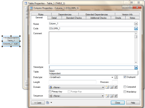 Now we have a transform, we need a profile to include it in.  There are only a few options to choose from.  When the model type is Physical Data Model, you can select a Family and Sub-Family which correspond to the target RDBMS and sub-family in the target model.   This tells PowerDesigner which transformations to allow/deny (show/hide) when you’re actually generating a data model.  I’m using Oracle here (mainly to make it easy to find the right box in the picture below), although you can leave them blank and have them apply universally.  I’ve named my profile toPDM.