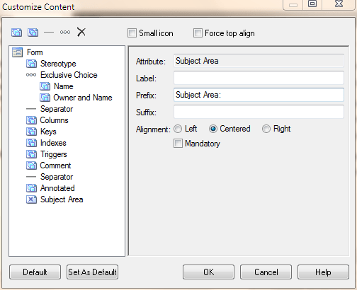 Now, let’s add SubjectArea. Go back to “Add Attribute” and choose the “Extended Attributes” tab this time. Select SubjectArea and click “OK”. Subject area is a text string, so you’ll have a slightly different set of options. Since I created a label on the extended attribute, I can leave the label property blank here, or I can change it. Prefix and Suffix are the values that will appear before and after the actual subject area (think “<<” and “>>” for a Stereotype).